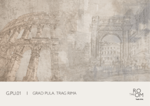 Motivi antičke Pule isprepliću se u suptilnoj kompoziciji koja priziva duh Rimskog Carstva i njegov trajni otisak u prostoru. Nježni crtež i patinirane teksture stvaraju osjećaj povijesne dubine i bezvremenske elegancije.