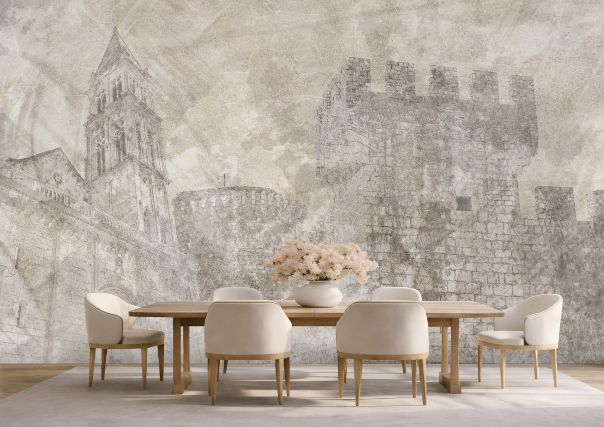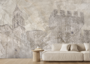 Tapeta prikazuje snagu i karakter trogirske kule kroz suptilne teksture i skicirane detalje koji prizivaju duh prošlih vremena. Prostor dobiva osjećaj stabilnosti, povijesti i autentične mediteranske elegancije.