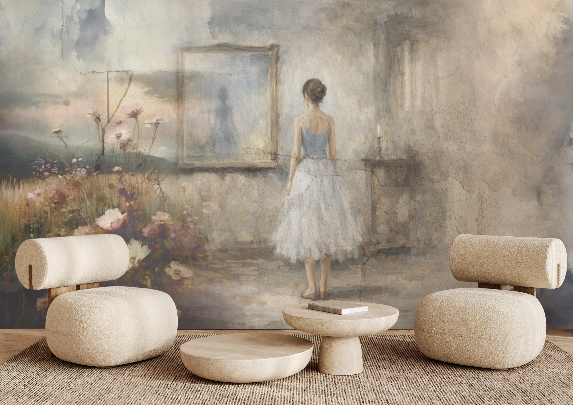 Roza prikazuje trenutak tišine u kojem se susreću unutarnji svijet i svijet oko nas. Figura okrenuta prema odrazu otvara prostor za misao, osjećaj i osobnu priču. Tapeta donosi nježnu atmosferu i osjećaj smirenosti u interijer.