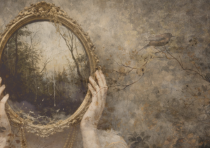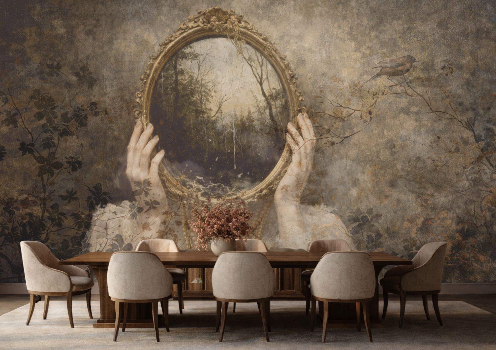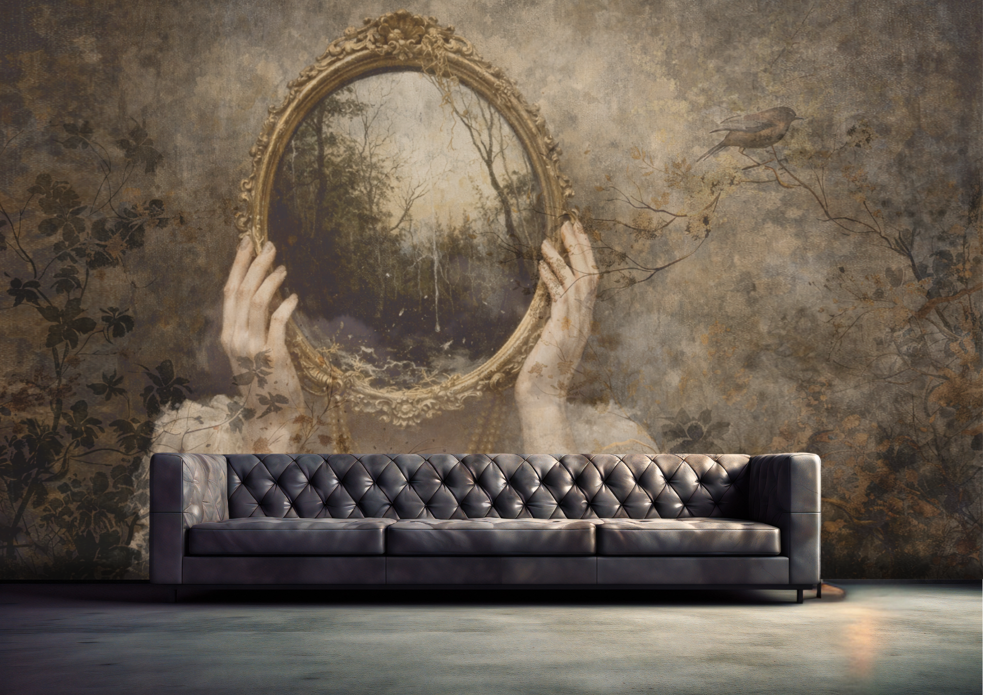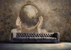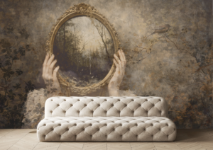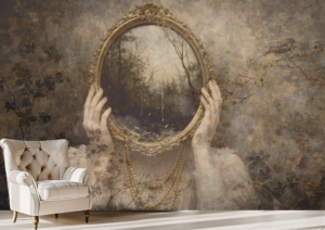 Sudbina otvara pogled prema unutarnjem svijetu i onome što tek dolazi. Ogledalo koje otkriva pejzaž umjesto odraza simbolizira put koji svatko nosi u sebi. Tapeta prostoru daje mističnu atmosferu i osjećaj priče koja se polako otkriva.